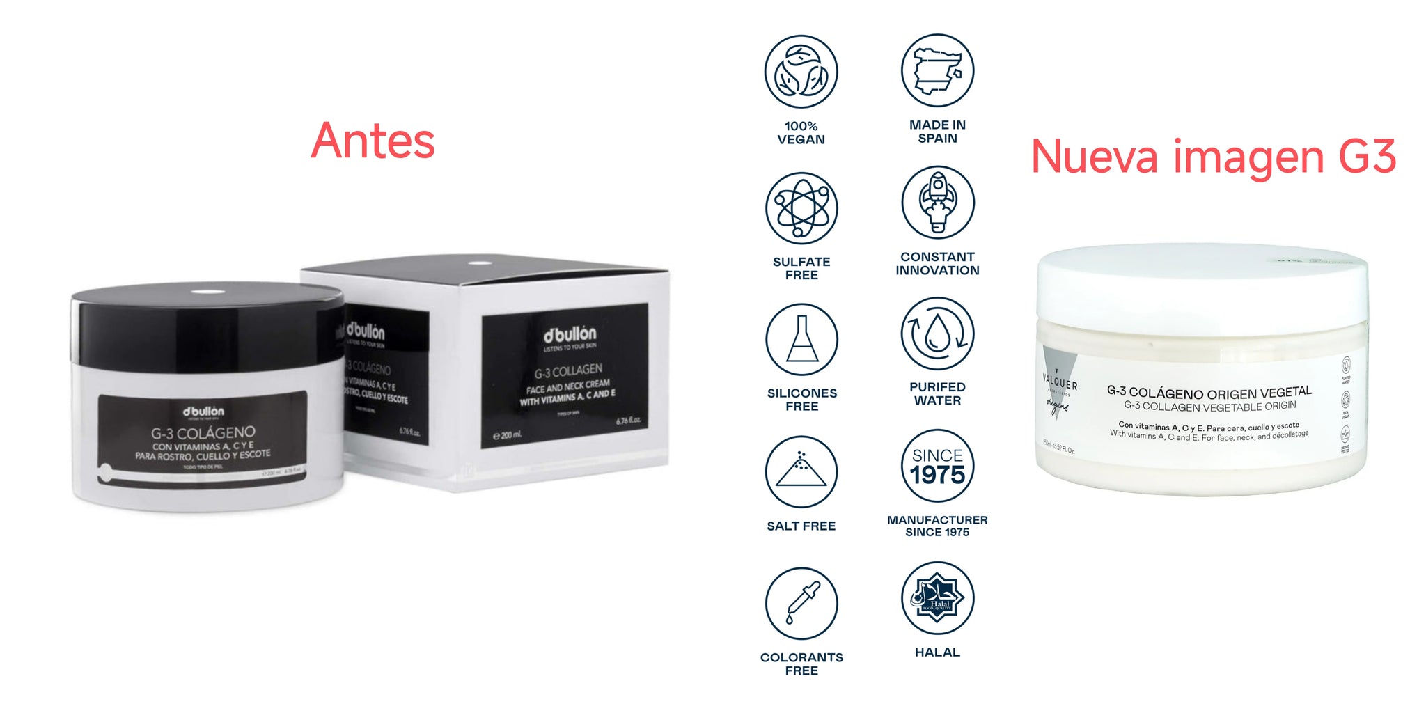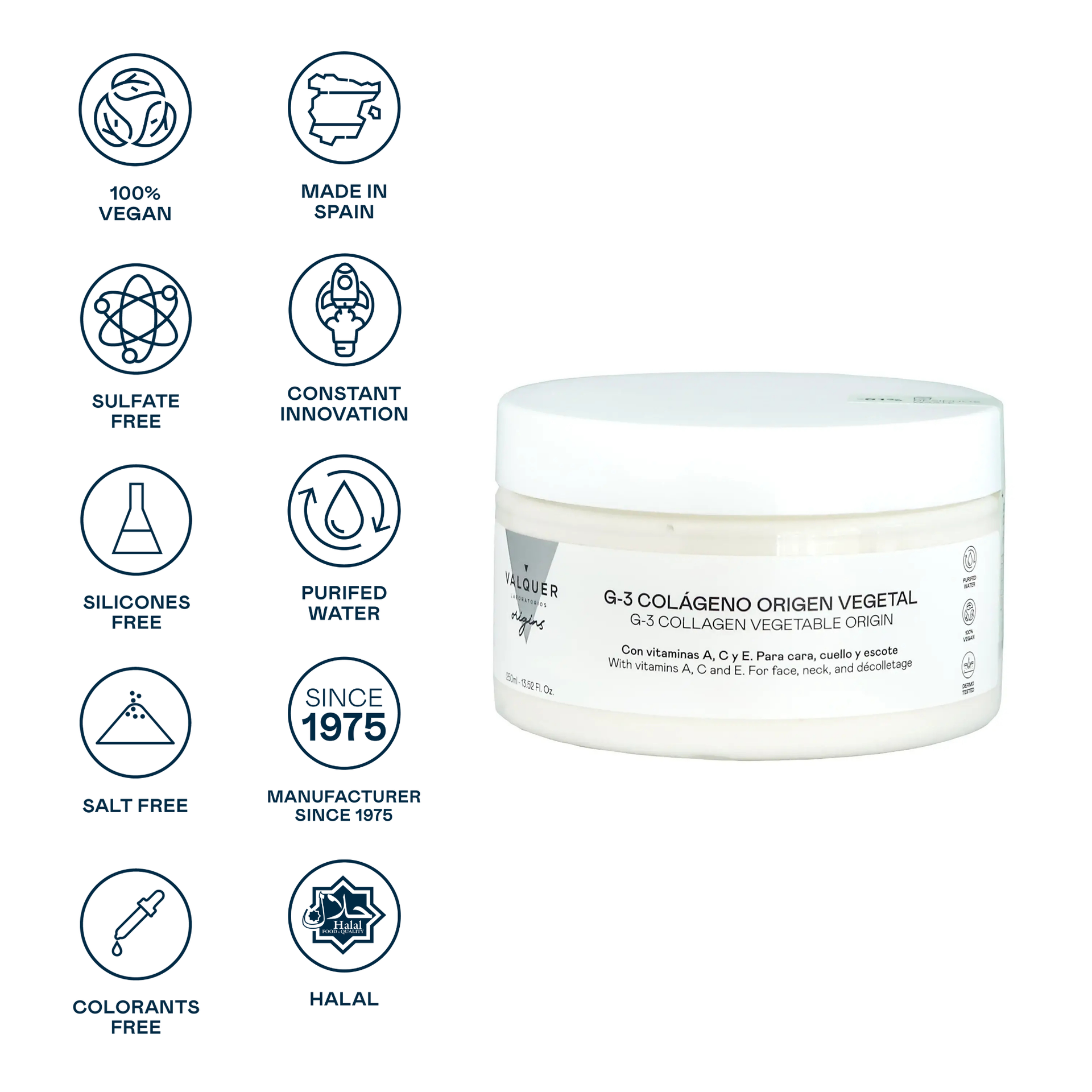Crema Colágeno G-3 de Valquer, formulada con colágeno de origen vegetal y un potente complejo de vitaminas A, C y E. Esta crema con colágeno es ideal para el cuidado diario del rostro, cuello y escote, proporcionando hidratación, firmeza y una mayor elasticidad a la piel.
